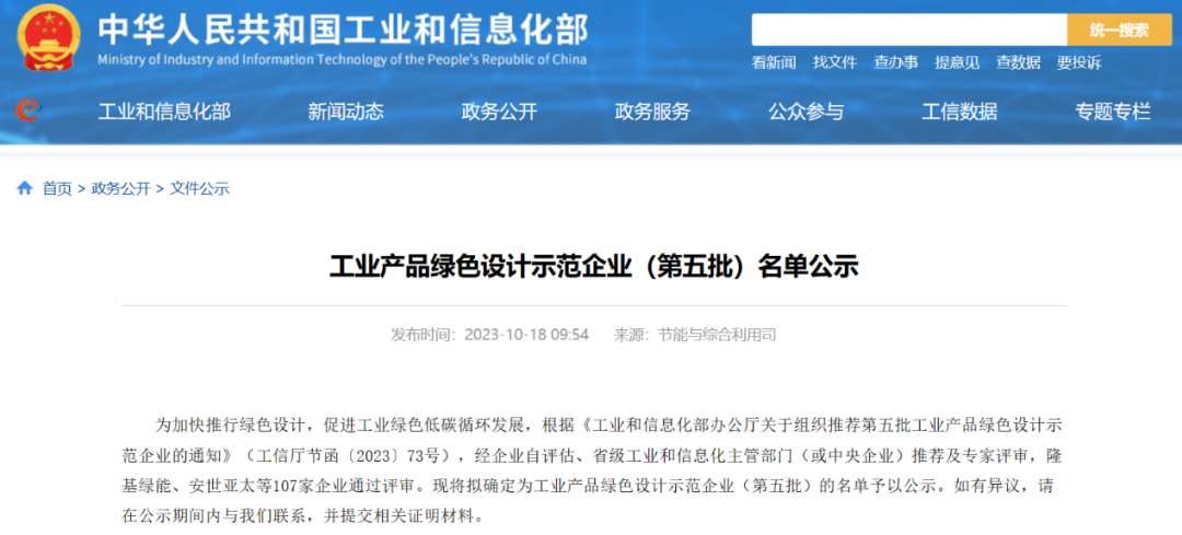 近日,工业和信息化部公布“工业产品绿色设计示范企业(第五批)”名单,3377体育(中国)科技有限公司官网凭借在国家级创新平台、绿色工厂、绿色标准等方面的突出优势,通过层层评审成功入选。