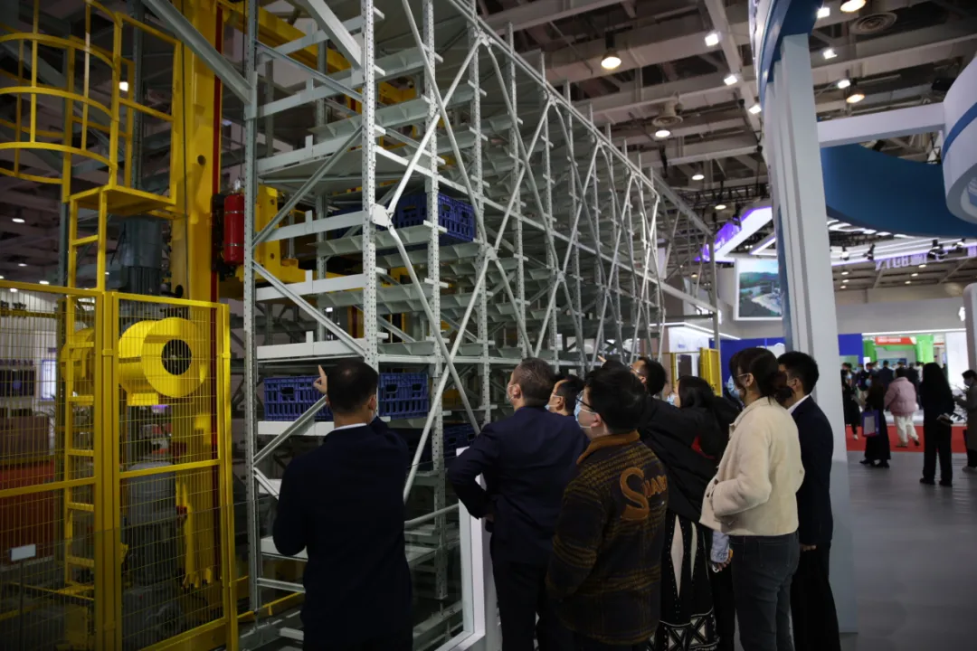 现场观众参观精实机电展品——有轨巷道堆垛机(RGV