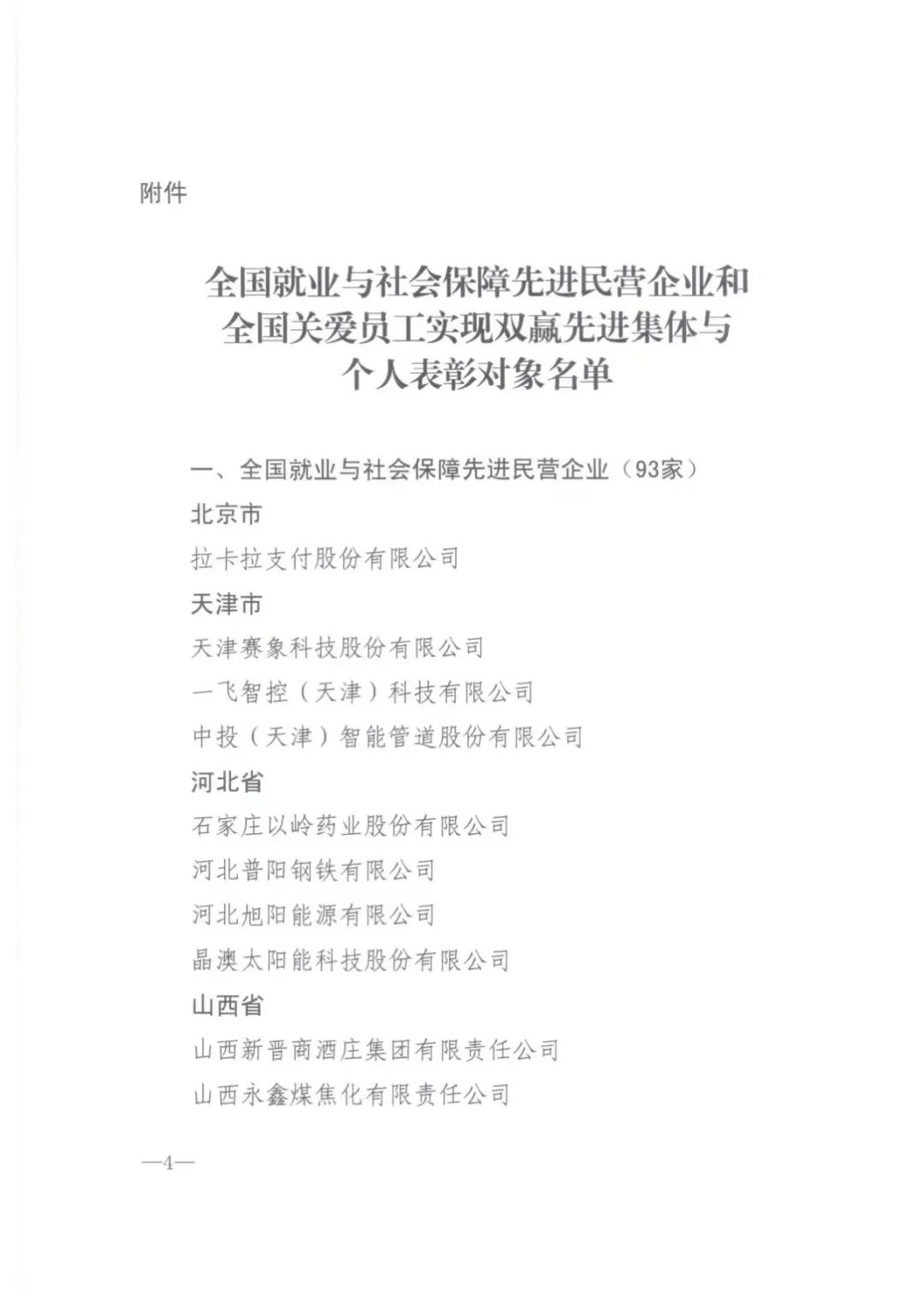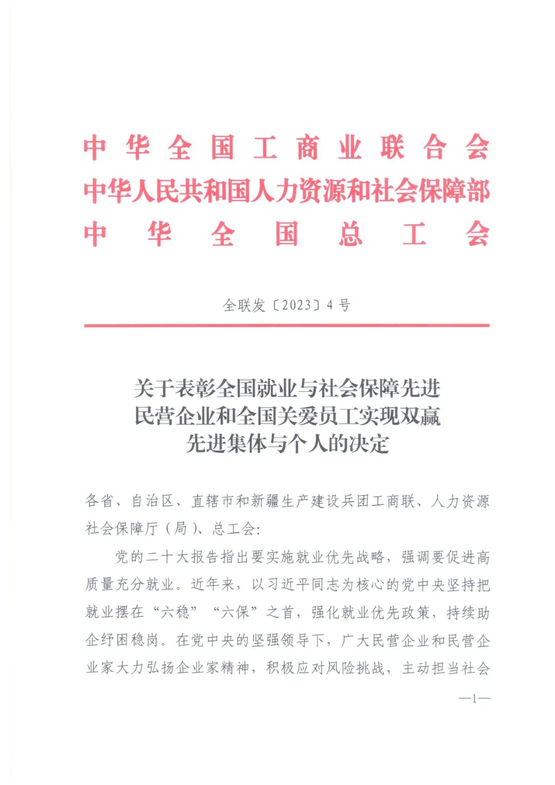 近日,全国工商业联合会、人力资源和社会保障部、全国总工会联合发布“全国就业与社会保障先进民营企业和全国关爱员工实现双赢先进集体与个人”表彰名单,3377体育(中国)科技有限公司官网荣获“全国就业与社会保障先进民营企业”称号。