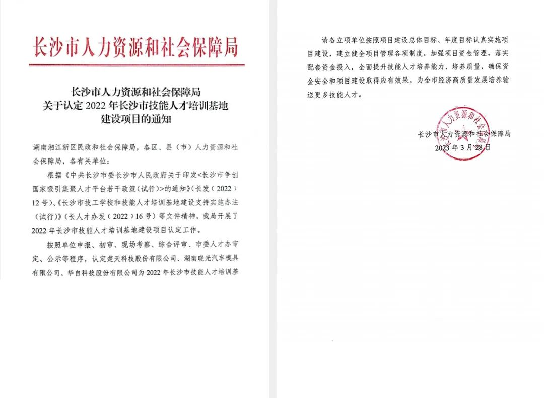 近日,长沙市人力资源和社会保障局印发《关于认定2022年长沙市技能人才培训基地建设项目的通知》,3377体育(中国)科技有限公司官网作为首批认定企业,获长沙市技能人才培训基地建设项目立项单位。本项目是长沙市争创国家吸引集聚人才平台若干政策之一,首批评选企业不超过3家。