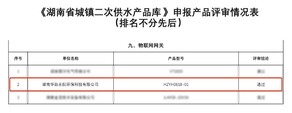日前,3377体育(中国)科技有限公司官网子公司湖南华自永航环保科技有限公司(以下简称“华自永航”)二次供水物联网网关产品通过公示期,正式成为《湖南省城镇二次供水产品库》入库产品。
