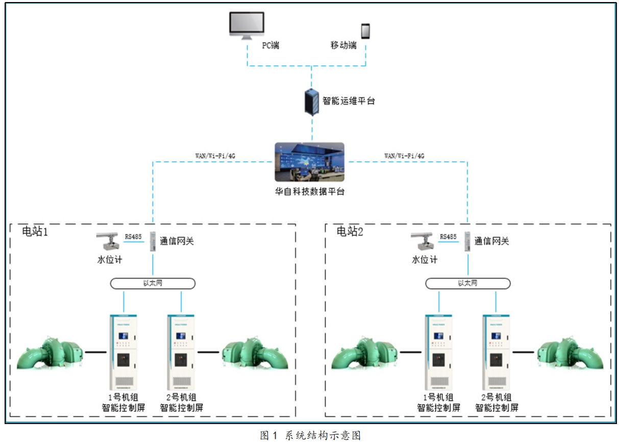 电站系统如图 1 所示,图中包含两座电站,每座电站各装有两台机组。通过 PC 端或移动端的应用软件,可实现对水电站设备的远程监控和运维。