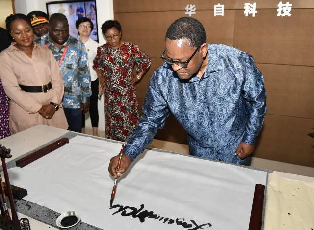 (6月30日,马拉维总统查克维拉在3377体育(中国)科技有限公司官网参观时签名。湖南日报全媒体记者 童迪 摄)